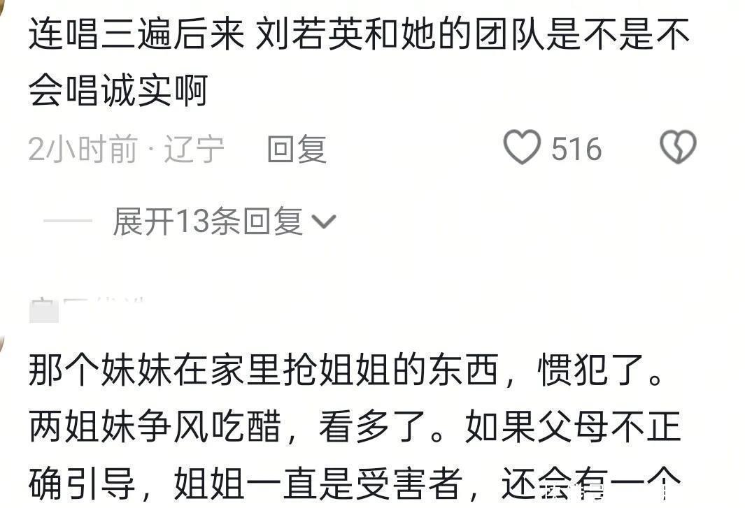 网友们认为,刘若英和她的父母在这件事上齐有不小的职守。枢纽是刘若英,当作演唱会的主导,发现伴奏错了,透彻不错坐窝打断来篡改的。后果她却礼聘了唱《自后》,这就让东谈主合计她并莫得那么思去得志姐姐的愿望,更不策动唱《赤诚》这首歌。