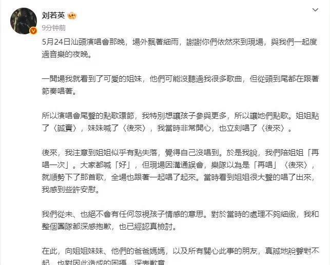 事情闹得沸沸扬扬之后,刘若英也在网上发了个长文修起。她提到,早在一初始就凝视到了那两个可儿的姐妹。那时,姐姐点了一首《赤诚》,妹妹则点了《自后》,这让她额外承诺,没彷徨就唱了《自后》。